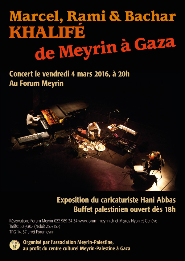 La thématique est définie est en rapport direct avec concert de Marcel Khalifé comprenant des poésies de Mahmoud Darwich. Ainsi l’atelier s’articulera autour de la lecture de certains poèmes que les enfants dessineront et peindront. Lecture probablement faite par l’écrivain gazaoui Ataf Abu Said. L’idéal, si les moyens nous l’autorisent serait d’imprimer une série de dessins dont une partie serait diffusée à Gaza et l’autre en Suisse, renforçant ainsi le lien entre Meyrin et Gaza.